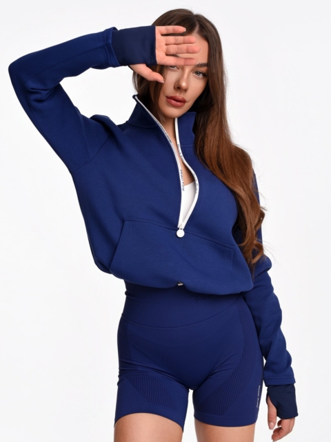 Sporty women’s short leggings type “biker shorts” in a rich dark blue color created from seamless, elastic and soft to the touch fabric. This model shapes the body perfectly, has a wide ribbed belt with woven inscription “Peach Pump”, which gently tightens the waist. The fabric of the leggings conceals problem areas, wicks moisture away from the body and has elements that shape the butt for a beautiful and graceful peach silhouette. With this model you will feel comfortable and confident. You can match the leggings with a sports bra in the same pattern or make your own sports outfit distinctive and different with our wide collection of jackets, sports bras and accessories.