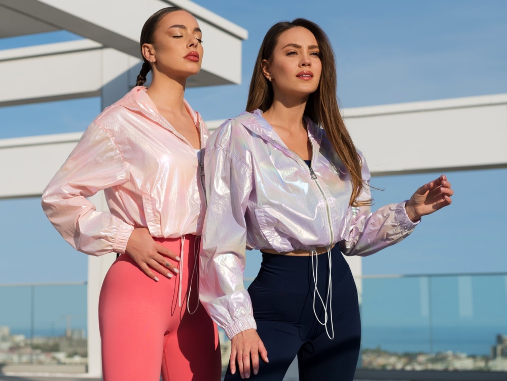 Purple ladies sports jacket with hood, limited edition of the brand with spectacular design in light purple color. The model is a type of windbreaker, suitable for running or walking, for windy summer days. The jacket has a cinch waist, hood and a beautiful silicone Peach Pump logo. The fabrics refracts the light beautifully and creates a sense of a cosmic shiny design. With this model you will be noticed and different, it combines perfectly with sports outfits in plain colors of the brand.