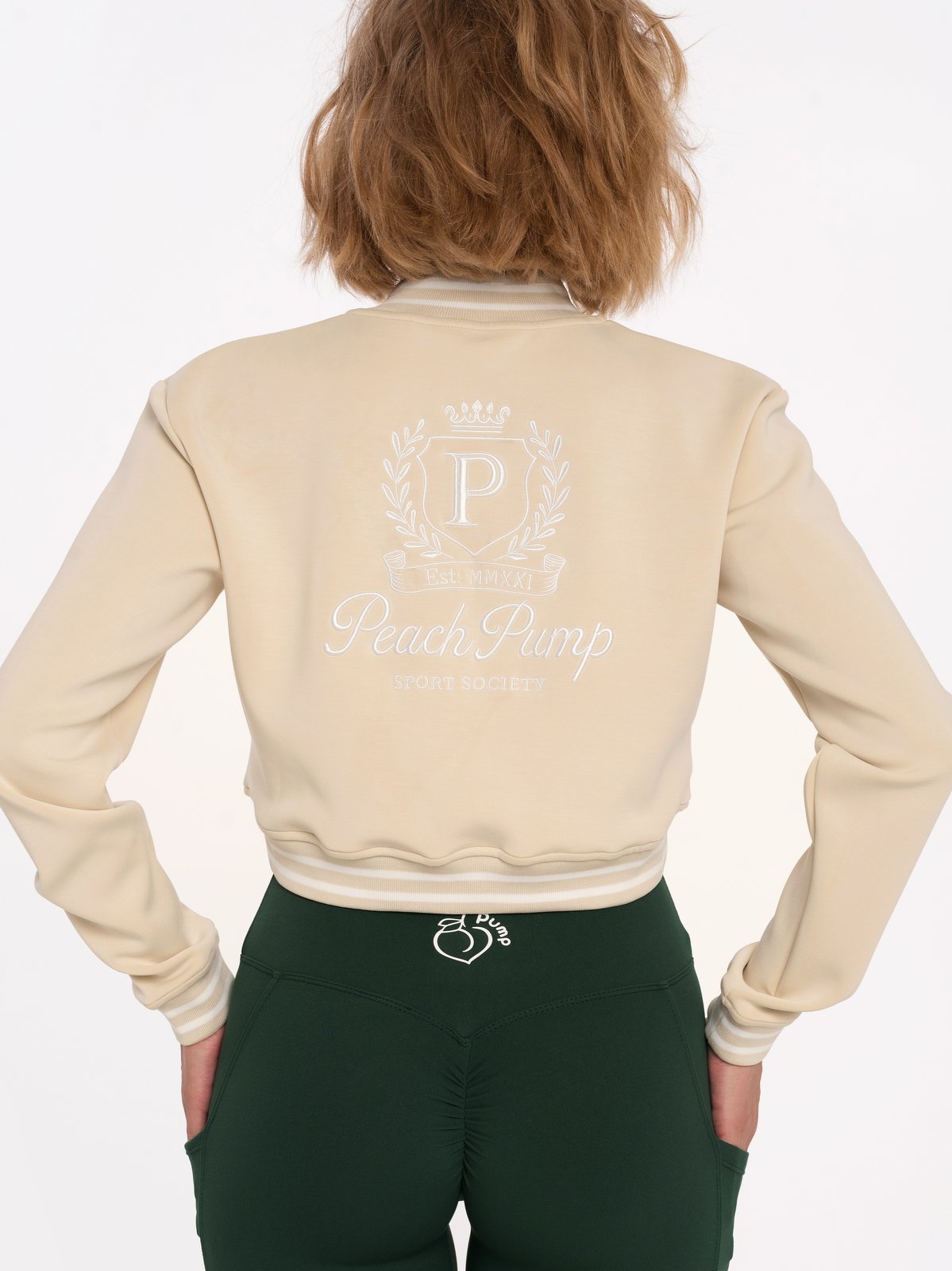 Късо бежово спортно яке с бродерия на гърба изработено от мека и гладка материя, осигуряваща комфорт при спорт или ежедневно носене. Моделът е с двоен цип с гравирано лого Peach Pump в предната част, който позволява различни начини на носене- изцяло закопчано, полуотворено или като акцент в стайлинга . Якето разполага с два странични джоба, които се затварят с цип отново с гравирани ципове на марката. Ръкавите, яката и долният кант са с еластични рипсени маншети, които осигуряват удобно прилягане и подчертават спортния силует. Особен акцент е детайлната 2D и 3D бродерия на гърба. В предната част има допълнително малко метално лого Peach Pump.