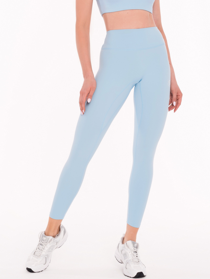 Светло син спортен дамски клин с изчистен дизайн , без оформящ ефект. Моделът няма шев в предната част, което е предпочитано от повечето дами и има шев в задната част на клина. Еластична лятна материя, която оформя тялото и широк колан, който подчертава талията. Има 3D лого в предната и задна част на клина. Шевовете на модела са плоски и не предизвикват дразнене. Подходящ е за силови или аеробни тренировки, не задържа влагата в тялото. Може да се съчетае с къса блуза в комплект , направена от същата материя.
