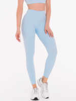 Светло син спортен комплект клин в изчистен дизайн , без оформящ ефект и блуза с къс ръкав. Блузата има подплънки , които се махат, подходяща е за фитнес, бягане, аеробни упражнения или разходка в парка, има скрит ластик в долната част и материя, която не задържа влагата в тялото. Клинът няма шев в предната част, което е предпочитано от повечето дами и има шев в задната част на клина. Еластична лятна материя, която оформя тялото и широк колан, който подчертава талията. Има 3D лого в предната и задна част на клина. Шевовете на модела са плоски и не предизвикват дразнене. Подходящ е за силови или аеробни тренировки, не задържа влагата в тялото. Комплекта се предлага в няколко разцветки.